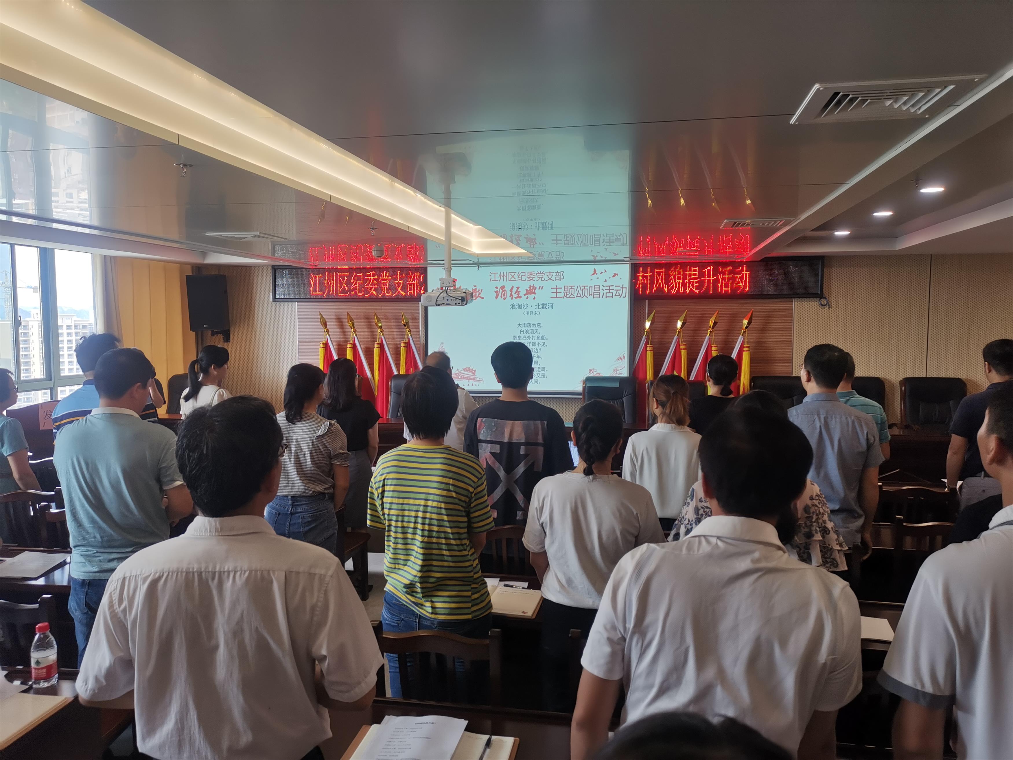 团结就是力量,这力量是铁,这力量是钢……”“大雨落幽燕,白浪滔天,秦皇岛外打鱼船,一片汪洋都不见……”在激昂的歌声和朗诵声中,江州区纪委党支部8月份的“固定党日+”活动拉开了序幕。