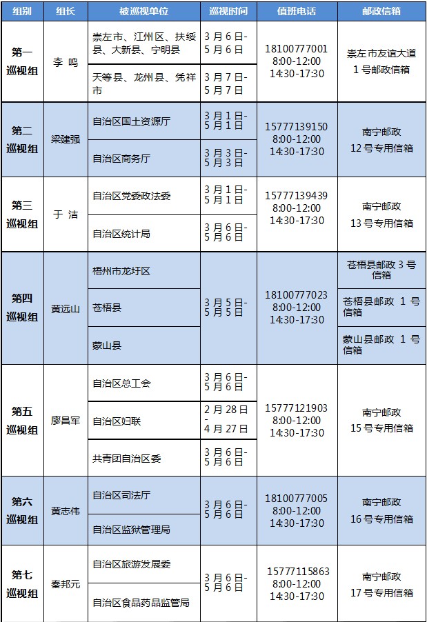 根据自治区党委的统一部署,本轮巡视对崇左市及所辖江州区、扶绥县、大新县、天等县、宁明县、龙州县、凭祥市等7个县(市、区),自治区旅发委、商务厅、统计局、国土厅、食品药品监管局等5家自治区扶贫专责小组成员单位,自治区党委政法委、司法厅、监狱管理局等3家政法机关部门,自治区总工会、妇联、团委等3家群团组织开展常规巡视;对梧州市所辖龙圩区、苍梧县、蒙山县等3个贫困县(区)开展扶贫领域专项巡视。