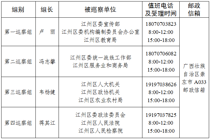 根据巡视工作条例及有关规定,巡察组在巡察期间分别设专门值班电话、邮政信箱,主要受理反映被巡察单位领导班子及其成员、二层机构主要负责人和重要岗位领导干部问题的来信、来电、来访,重点是关于违反政治纪律、组织纪律、廉洁纪律、群众纪律、工作纪律和生活纪律等方面的举报和反映。其他不属于巡察受理范围的信访问题,将按规定转有关部门处理。巡察组受理信访截止时间为2024年12月20日。