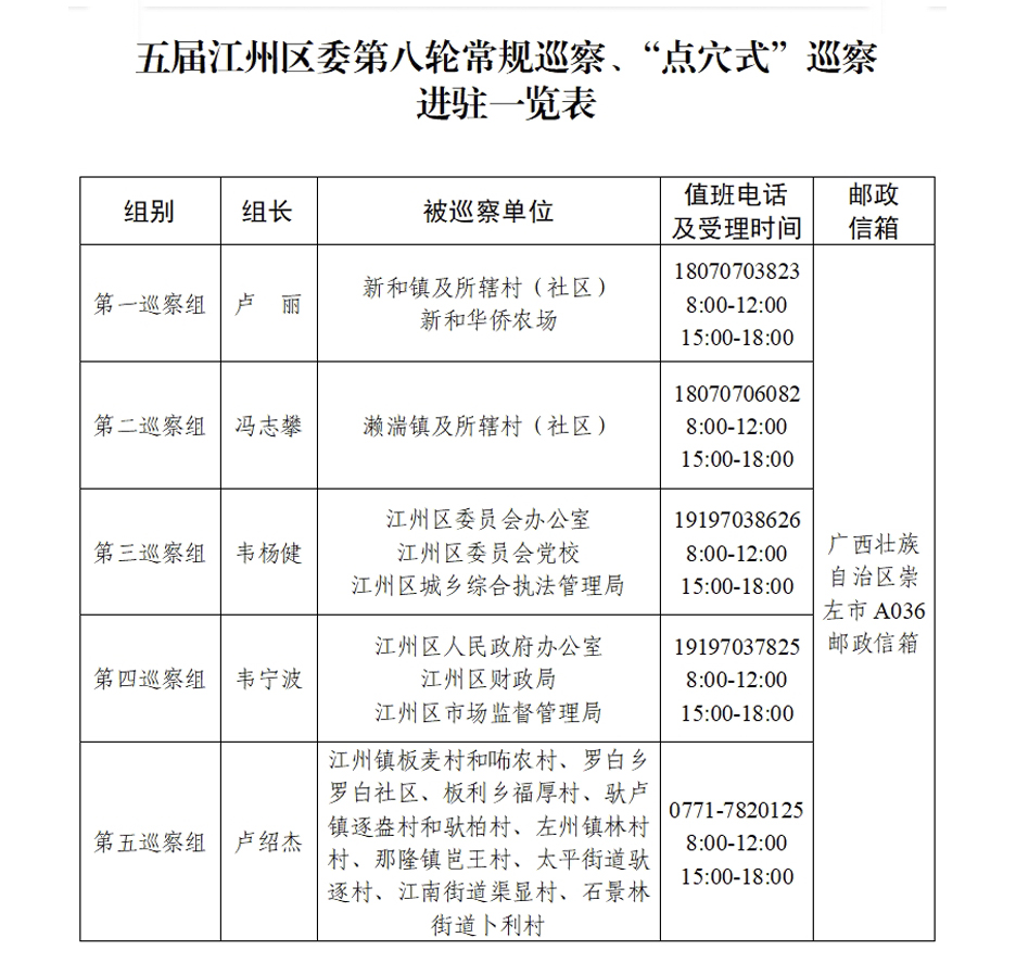 本轮巡察以深入学习贯彻习近平新时代中国特色社会主义思想为指导,旗帜鲜明把“两个维护”作为根本任务,聚焦党的路线方针政策和党中央重大决策部署,自治区党委、崇左市委、江州区委贯彻举措在基层的落实情况;聚焦群众身边不正之风和腐败问题;聚焦落实新时代党的组织路线情况;聚焦巡视巡察、审计等各类监督发现问题整改落实和成果运用情况,加强政治监督,纠正政治偏差。“点穴式”巡察期间,聚焦农村集体“三资”管理、惠民惠农补贴资金、乡村振兴资金管理使用和工程项目建设方面,查找群众身边不正之风和腐败问题,影响乡村振兴战略稳步推进等方面情况,为奋力谱写建设面向东盟开放合作的现代化南疆国门城市江州篇章提供坚强保障。