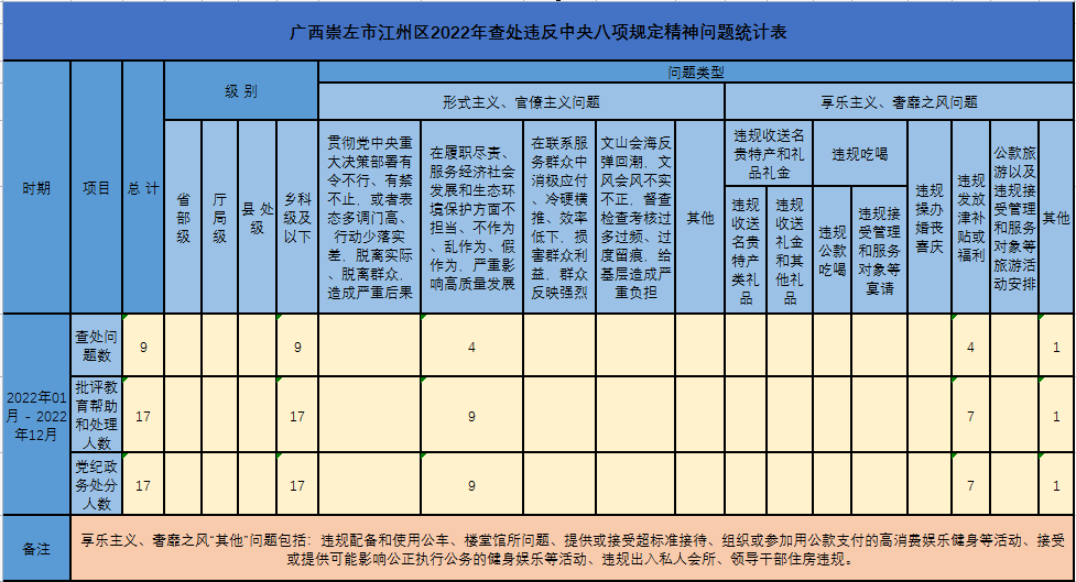 2022年1-12月江州区查处违反中央八项规定精神问题9起