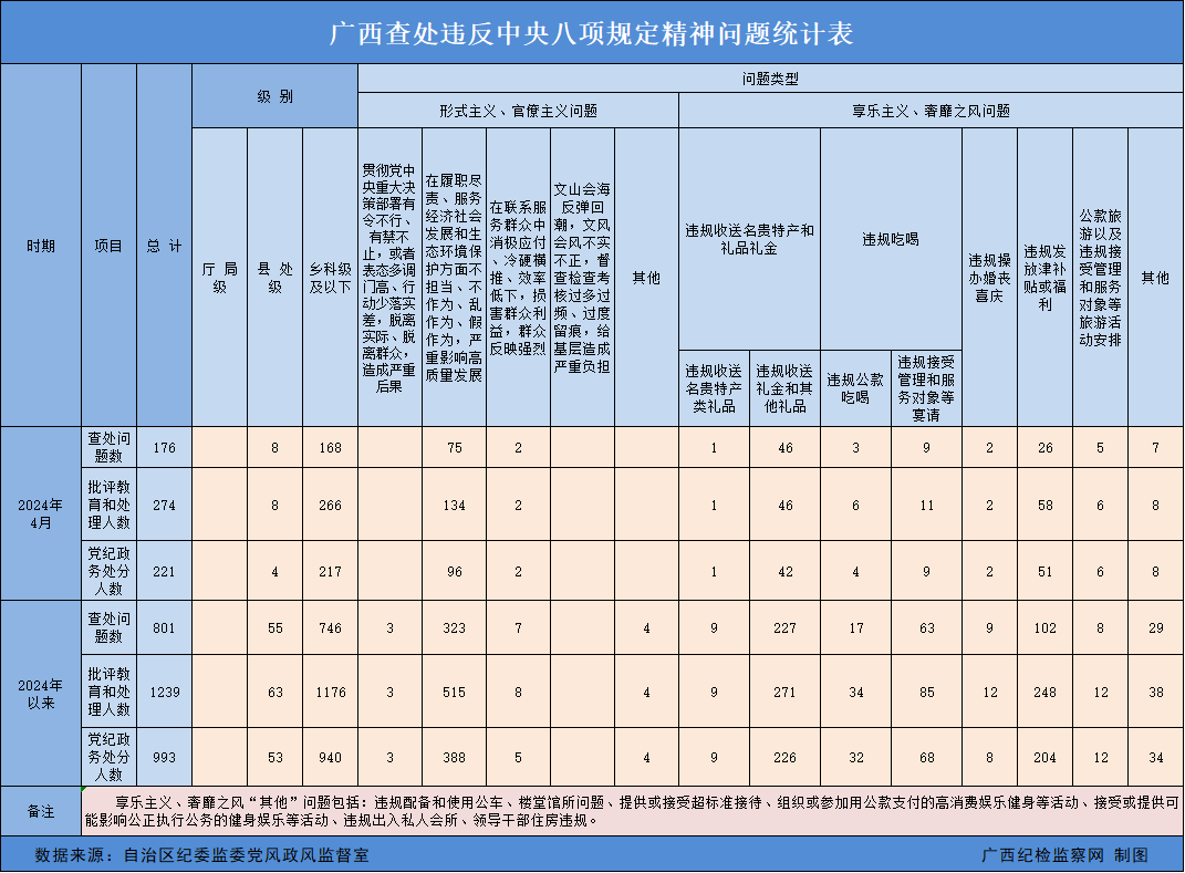 2024年4月广西查处违反中央八项规定精神问题176起